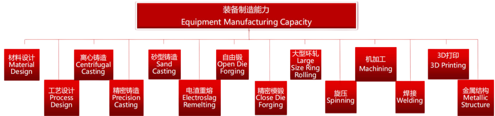 The company has the in-house manufacturing capabilities covering all processes from material smelting, material forming to equipment prefabrication. It owns a complete set of manufacturing equipment, including smelting, refining, electroslag remelting, vacuum degassing, open-die forging, close die forging, external forging, ring rolling, spinning, 3D printing, static casting, heat treatment, welding, and CNC finishing. The products comply with international standards.