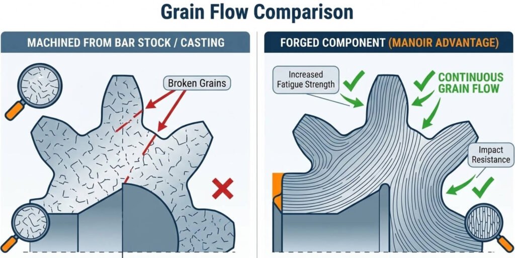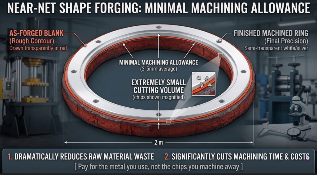 By forging closer to your final dimensions, we drastically reduce raw material waste and cut down your subsequent CNC machining time. You pay for the metal you use, not the chips you machine away.